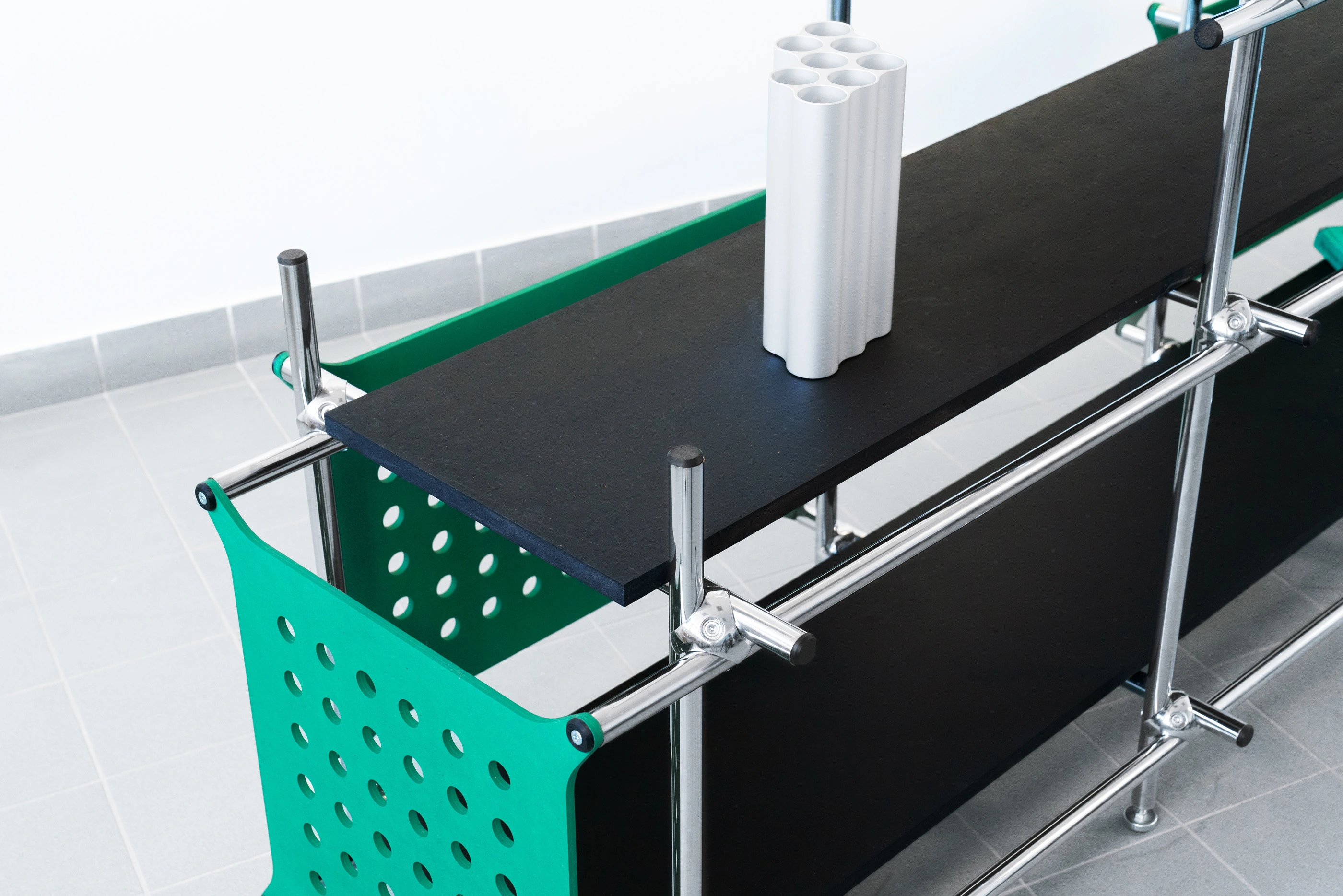 Constructed from a chromed tubular frame and valchromat mdf panels, the unit balances structural clarity with visual rhythm. Black shelving surfaces contrast the metallic framework and serve as clean, understated platforms for display or storage. Its assembly relies on simple mechanical connections, allowing easy customization and reconfiguration. The design embraces openness and transparency, with a light footprint that suits contemporary interiors, from domestic spaces to creative studios.
